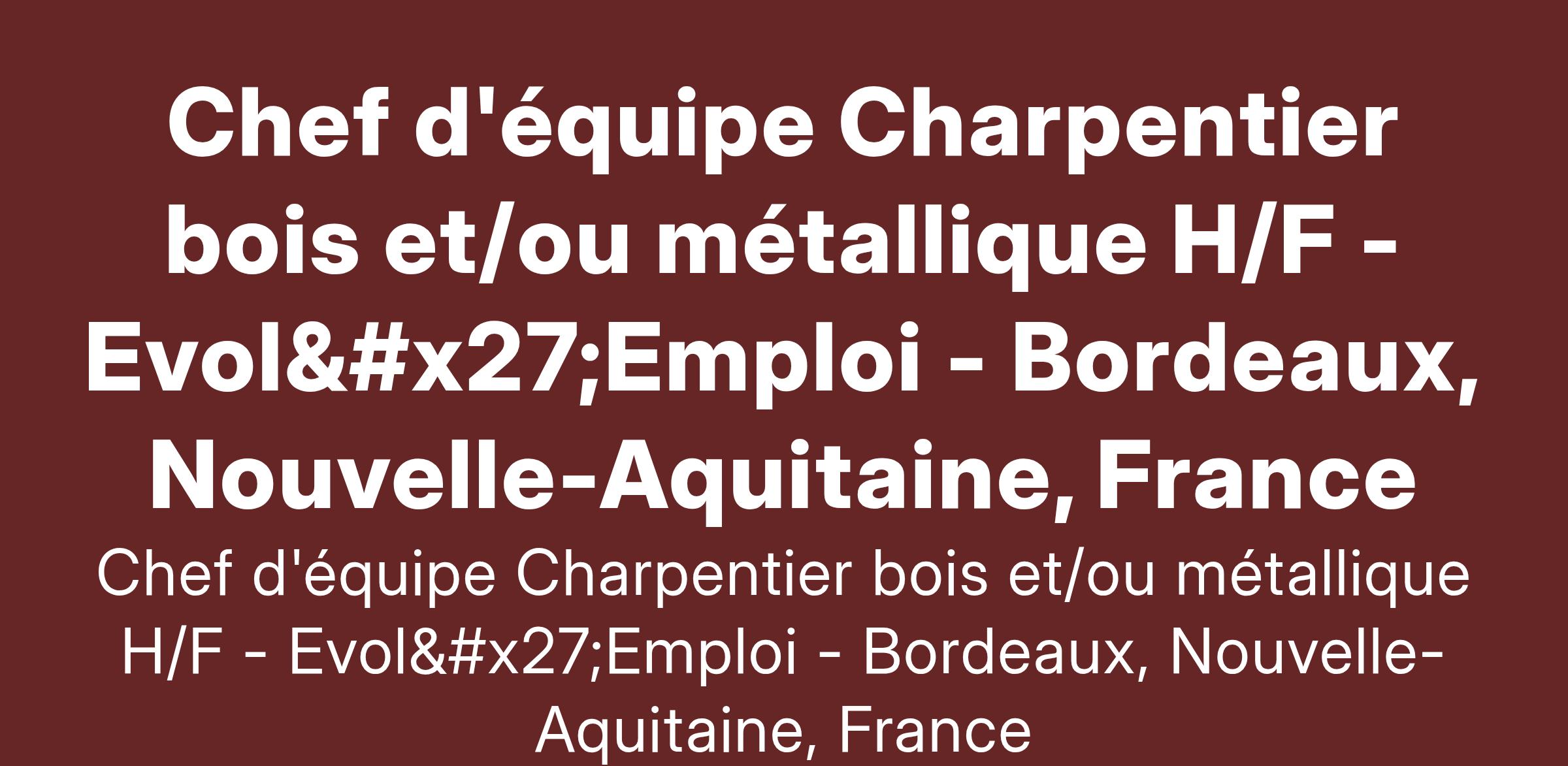 Idéalement, vous possédez un CAP/BEP Charpente et une expérience minimum de 2 ans sur le poste de Chef d'équipe.