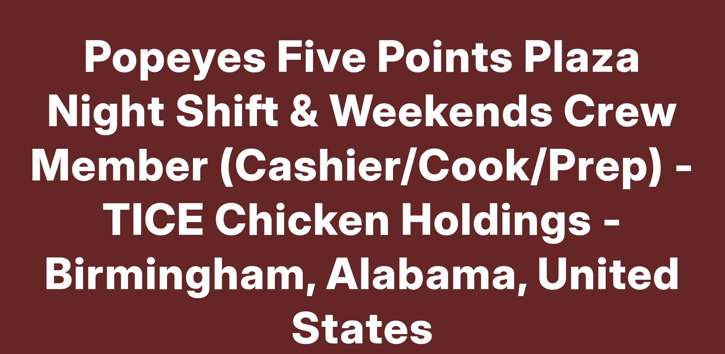 Popeyes Five Points Plaza Night Shift & Weekends Crew Member (Cashier/Cook/Prep) - TICE Chicken Holdings - Birmingham, Alabama, United States