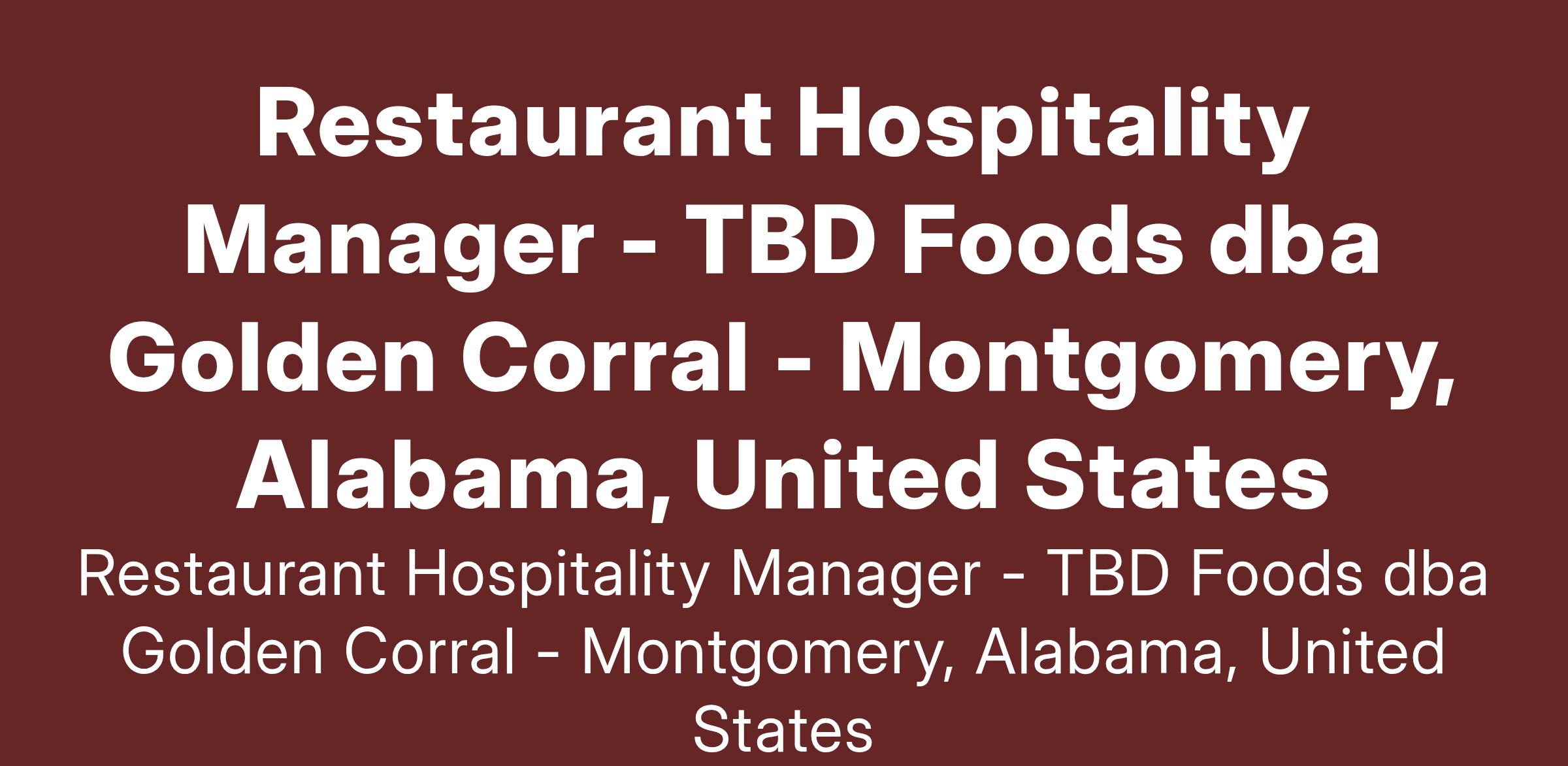 Our franchise organization, TBD Foods, LLC dba Golden Corral, is currently seeking energetic, friendly individuals to join our team!