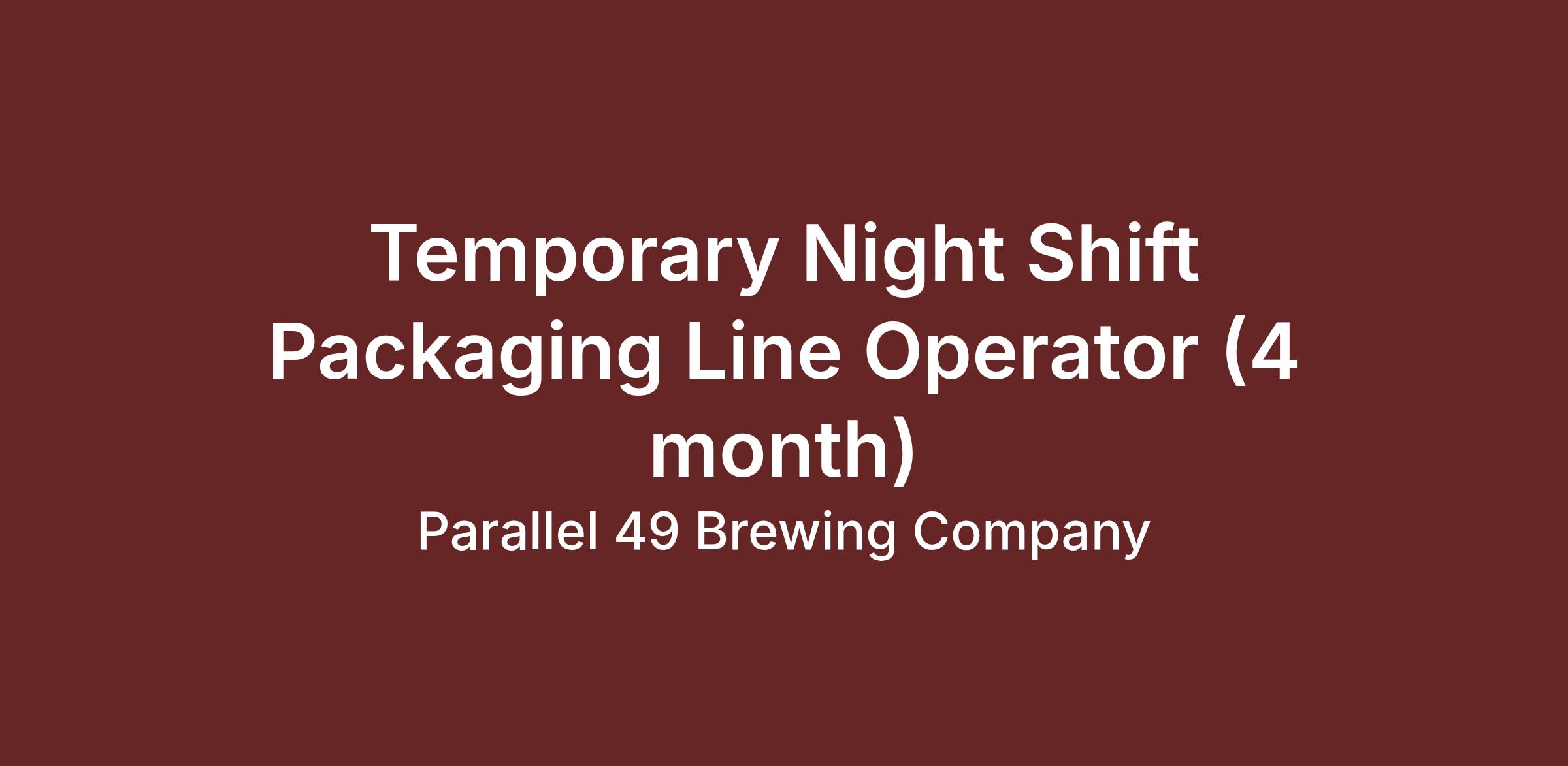 The Temporary Night Shift Packaging Line Operator is responsible for running packaging equipment at Parallel 49 Brewing’s production brewery in Vancouver, BC. Responsibilities include ensuring a safe work environment, monitoring packaged products to ensure a high level of quality, cleaning and sanitization of the plant and equipment, upholding Parallel 49’s quality standards, and proper use of mechanical equipment.