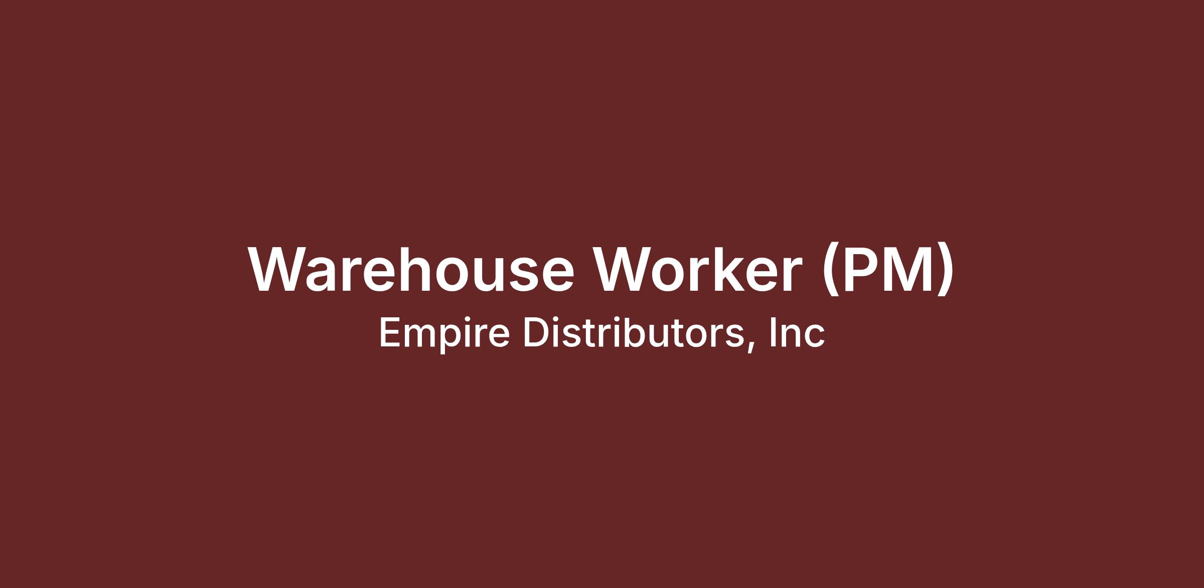 Empire Distributors Inc, A Leading Beverage Distributor is now hiring a PM Warehouse Worker. Our company offers competitive wages, potential growth opportunities, and excellent benefits that include, but aren’t limited to health care, retirement benefits, paid time off, company paid life insurances, and supplemental Aflac and legal plans.